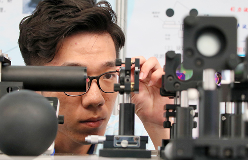 A student from Shandong University, Weihai, adjusts a "Gravitational Wave Simulation and Detection Experiment System" at the 15th Challenge Cup Shandong province's University Students Extracurricular Academic Technology Competition in Yantai, East China's Shandong province, on May 21, 2017. The competition attracted 206 teams from 59 universities who brought projects covering 10 areas such as mechanical control, life sciences, energy and chemical industry and social management. [Photo/VCG] |
