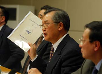 | | Zhang Wenkang (C), the nation's Health Minister, speaks at a press conference held April 3 in Beijing. He stressed that the Severe Acute Respiratory Syndrome, or SARS, is under control in China and appealed to some foreign organizations and companies that had cancelled their staff's trips to China to re-consider their decisions. [newsphoto.com.cn] |