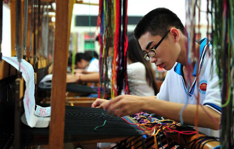 Newlyweds wearing traditional Han costumes (hanfu) attend a group wedding ceremony at the Erqi Square, in Zhengzhou, capital city of Henan province, September 12, 2013. 16 couples participated in the group wedding, which was conducted in accordance with traditional Han Chinese wedding customs. [Photo/icpress]